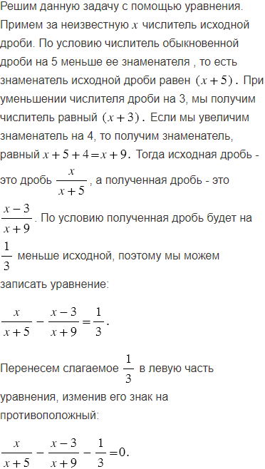 Числитель обыкновенной дроби на 5 меньше ее знаменателя. Если числитель этой дроби уменьшить на 3, а знаменатель увеличить на 4, то полученная дробь будет на