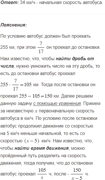 пути, он остановился на 1 ч, а затем продолжил движение со скоростью на 5 км/ч меньше начальной. Найдите начальную скорость автобуса, если в пункт назначения он прибыл через 9 ч после выезда.