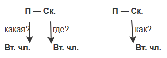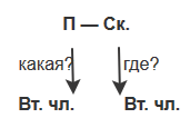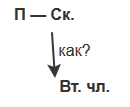Чтобы начертить последнюю схему, сначала, необходимо найти в предложении подлежащее и сказуемое и обозначить их на схеме буквами П. и Ск., затем определить, к какому члену предложения (подлежащему или сказуемому) относится второстепенный член. Слово душистая (второстепенный член), поясняет подлежащее, следовательно, под буквой П. в схеме пишем вопрос, который задаётся от подлежащего к слову душистая (какая?), ставим рядом с вопросом стрелочку, ниже обозначаем второстепенный член (Вт. чл.).