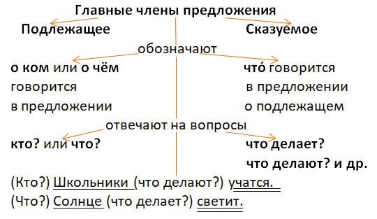 Главные члены предложения - подлежащее и сказуемое. Подлежащее обозначает о ком или о чём говорится в предложении, отвечает на вопросы кто? или что? и подчёркивается одной чертой. Сказуемое обозначает что говорится о подлежащем, отвечает на вопросы что делает?, что делают? и другие, подчёркивается двумя чертами.