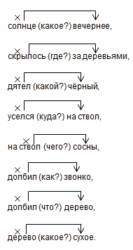 1. Солнце скрылось; вечернее солнце; скрылось за деревьями. 2. Чёрный дятел; дятел уселся; уселся на ствол; на ствол сосны. 3. Он долбил; долбил звонко; долбил дерево; сухое дерево.