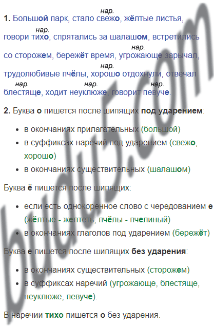 Больш.. парк, стало свеж.., ж..лтые листья, говори тих.., спрятались за шалаш.., встретились со сторож..м, береж..т время, угрожающ.. зарычал, трудолюбивые пч..лы, хорош.. отдохнули, отвечал блестящ.., ходит неуклюж.., говорит певуч.. .