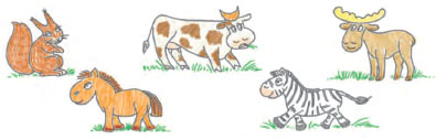 • Каким одним словом можно назвать всех, кто нарисован на доске? Запиши это слово, поставь двоеточие. После этого запиши в алфавитном порядке названия зверей на рисунках. Поставь ударение, подчеркни буквы гласных в безударных слогах. Подчеркни ударные слоги.
