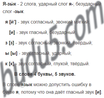 ♦ Произнеси по слогам слово язык. Из каких звуков оно состоит? Напиши это слово. Какими буквами обозначены звуки? Сколько в слове слогов? Назови ударный слог, безударный слог.